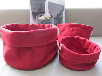 Von meiner Schwiegermutter gab es diese hübschen Stoffkörbchen von Stelton in der Farbe rot, passend zu unserer Küche. Die Große hatte sie als Brötchenkorb im Sinn, die kleinen werde ich aber sicherlich für meinen Kosmetikkram verwenden. Neulich hatte ich erst solche Stoffkörbe in der Hand und wollte sie schon zur Kasse tragen, deshalb kommt dieses Geschenk genau richtig.