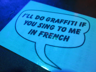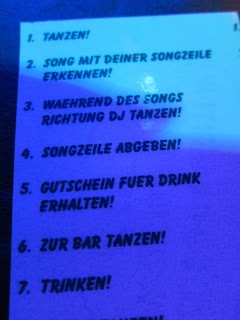 Huch, dann versuche ich mal etwas Licht ins Dunkel zu bringen 😉 Man hat beim Reingehen in den Club diese Kärtchen bekommen. Auf jedem Kärtchen steht eine andere Zeile aus einem Song. Wenn das Lied mit dieser Zeile gespielt wird und man erkennt es, dann bekommt man vom DJ einen Gutschein für ein Getränk (wird auf der Rückseite der Karte erklärt). Die Songzeile ist übrigens aus einem Maximo Park Song 🙂