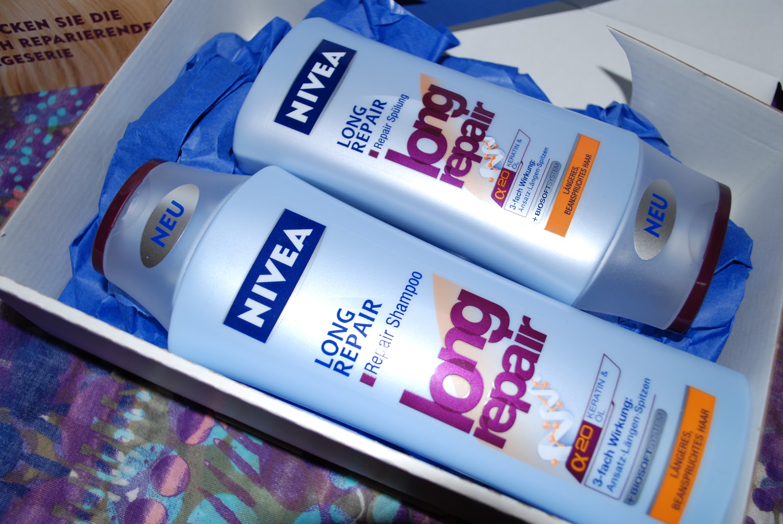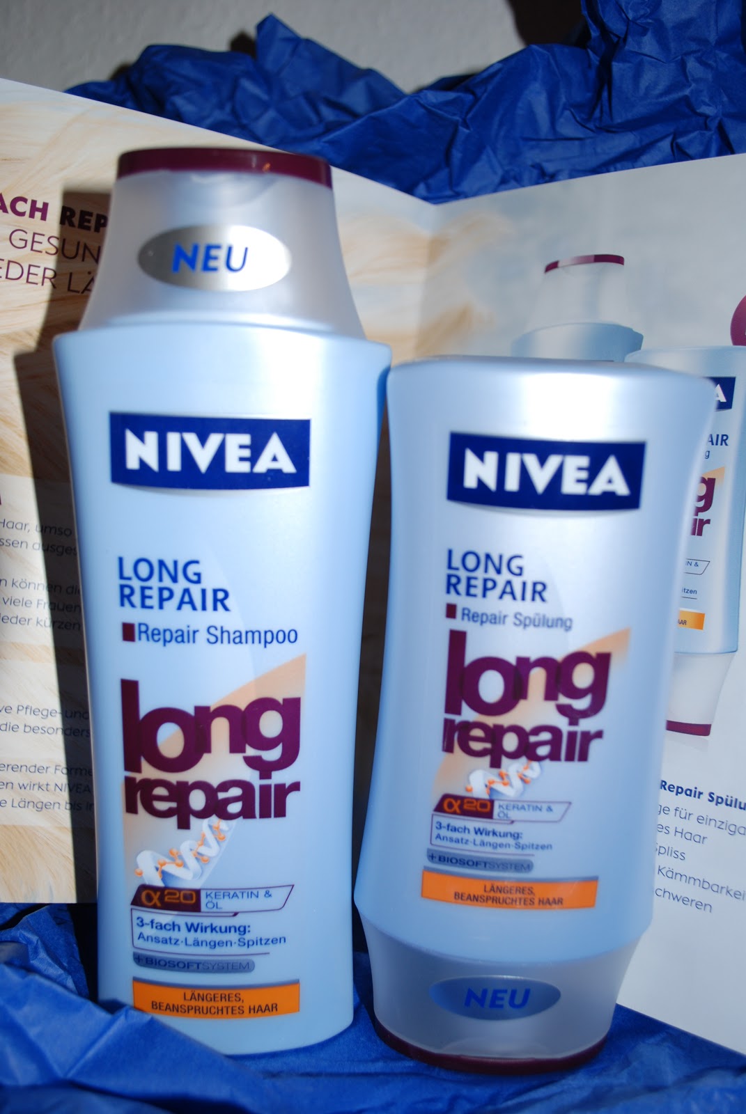 Das Testpaket umfasst das neue Nivea Long Repair Shampoo und Spülung in Originalgröße und eine Produktinformation. Die neue Pflegeserie umfasst noch mehr Produkte (Styling Mousse, Styling Spray, 1-Minute Haarkur und Express Pflegespray) und wird bald auch im Handel erhältlich sein. Ein genauer Erscheinungstermin steht nicht dabei.