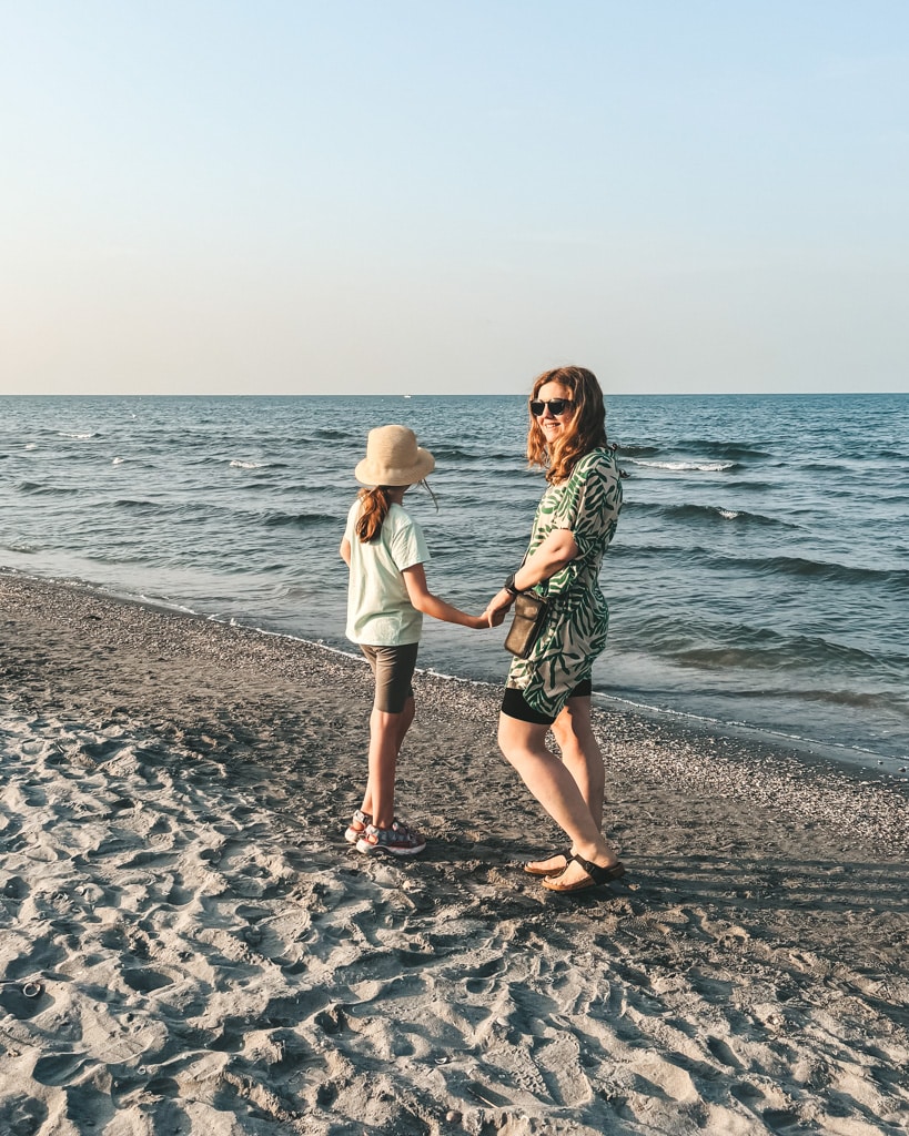 Der Strand hat uns sehr gut gefallen. Überzeugt hat uns der feine Sand, das flach abfallende Wasser und die viele Muscheln zum Sammeln. Also perfekt für Familien mit kleinen Kinder. Es gibt auch einen Spielplatz und natürlich Duschen und Toiletten. An der Strandbar habe mir gerne mal einen Frappe geholt oder einen Cappuccino getrunken, während unsere Tochter Muscheln gesammelt hat.