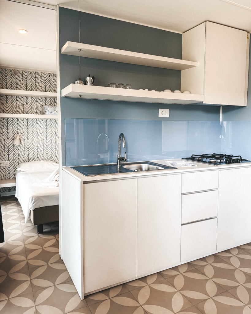 Mit 34 Quadratmetern Wohnfläche bietet das Venere Mobilheim Platz für bis zu fünf Personen. Auch Vierbeiner sind willkommen, ihr könnt also auch euren Hund mitbringen. TV, Klimaanlage und voll ausgestattete Kochecke sind ebenfalls vorhanden. Im Preis inbegriffen sind auch Handtücher, Bettwäsche sowie die Erstreinigung und Endreinigung. Lediglich eine Spülmaschine hätte ich mir noch gewünscht.