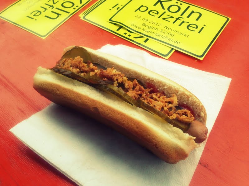 Ich habe mir natürlich den Bauch vollgeschlagen. Bei einem so großen Angebot fiel die Entscheidung schwer: Indisches Essen, Döner und Burger, Pizza, Falafel, Kuchen, Eis…. Alles vegan natürlich. Ich habe mich für einen veganen Hotdog und eine Seitanpfanne entschieden.