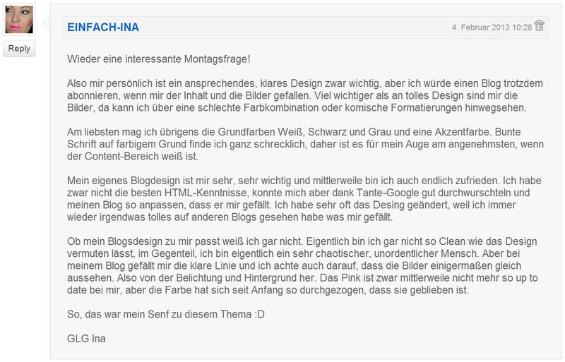 Zitat: “Ich finde es halt wirklich schade wenn der Inhalt super ist aber das Design scheußlich, immerhin lese ich hauptsächlich Beauty Blogs und wenn man über Schönheit schreibt sollte sich das schon im Design wiederspiegeln.”