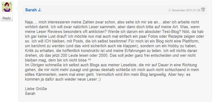 So schreibt zum Beispiel Sarah, dass sie die Zahlen zwar schon interessieren, sie aber nicht wirklich damit arbeite. Sie will sich nicht nur danach richten, was oft geklickt werde, sondern sie selbst bleiben und die Posts selbst bestimmen. Für sie sei ein Blog keine Plattform um berühmt zu werden, sondern um ein Hobby zu haben, konstruktive Kritik zu erhalten und ihre Erfahrungen zu teilen. Sie selbst schmeiße Blogs aus ihrer Leseliste, die ihr auf Dauer zu sehr in eine Richtung gehen, die ihr nicht mehr zusage und genau deshalb sei sie selbst auch nicht traurig wenn ein Leser auch mal gehe.