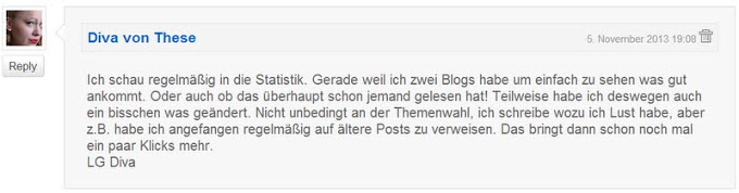 So schreibt zum Beispiel Diva von These, dass sie regelmäßig in ihre Statistik schaue, vor allem weil sie zwei Blogs habe und sie sehen möchte was gut ankommt. Teilweise habe sie deswegen auch schon etwas geändert, zwar nicht unbedingt an der Themenwahl, sie schreibe wozu sie Lust habe, sondern zum Beispiel verweise sie regelmäßig auf ältere Posts.