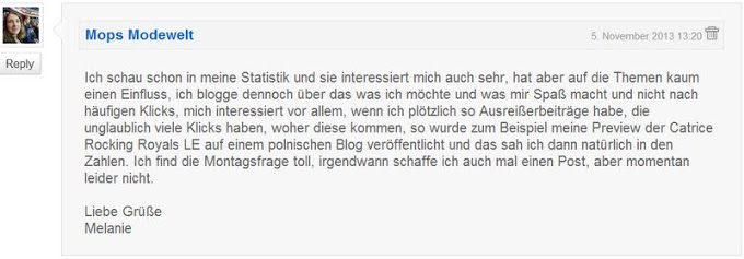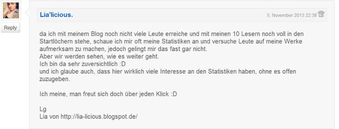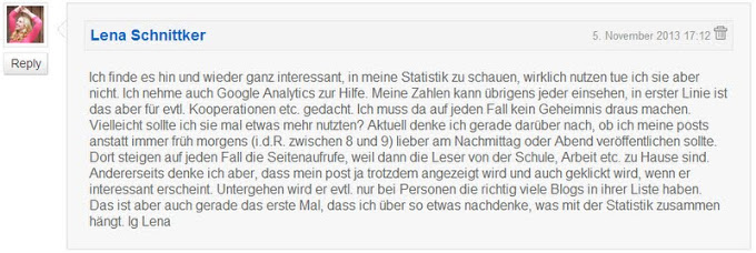 Zitat: “Ich denke, die Statistik ist eine gute Möglichkeit, den eigenen Blog zu optimieren und an Leserbedürfnisse anzupassen. Man sollte sich aber davon nicht zu sehr beeinflussen lassen und zum Beispiel traurig sein und grübeln wenn die Klickzahlen man nicht so gut sind, mir ist da dann wichtiger, dass ich Feedback bekomme und die schönsten Klickzahlen bringen einem doch nichts wenn keine Kommentare abgegeben werden und man nicht weiß, ob der Artikel nun gefallen hat oder nicht.”