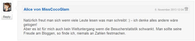 Dies vermutet auch Alice von MissCocoGlam. Natürlich freue man sich wenn viele Leute lesen was man schreibt, alles andere sei ihrer Ansicht nach gelogen.