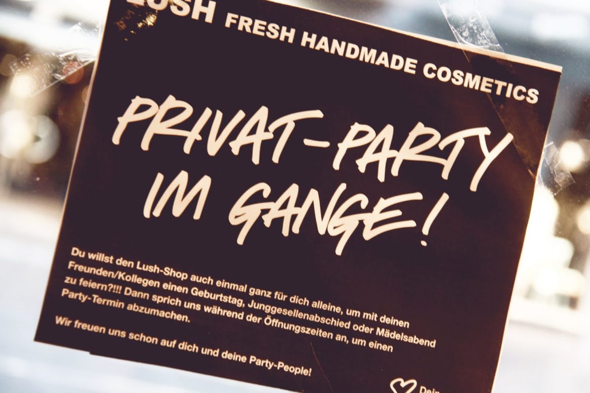 Die Planung ist hier völlig frei und individuell. Wie wir im Gespräch mit den Mitarbeitern erfahren haben, werden die Partys im Karlsruher Lush Shop sehr gerne und regelmäßig gebucht. Man sollte die Party also mindestens zwei Wochen vorher buchen. Je nach Anlass kann auch selbst Kuchen und Sekt mitgebracht werden. Besonders interessant fand ich die Möglichkeit, dass man auch selbst Lush Produkte (Badekugeln und Gesichtsmasken) herstellen kann!