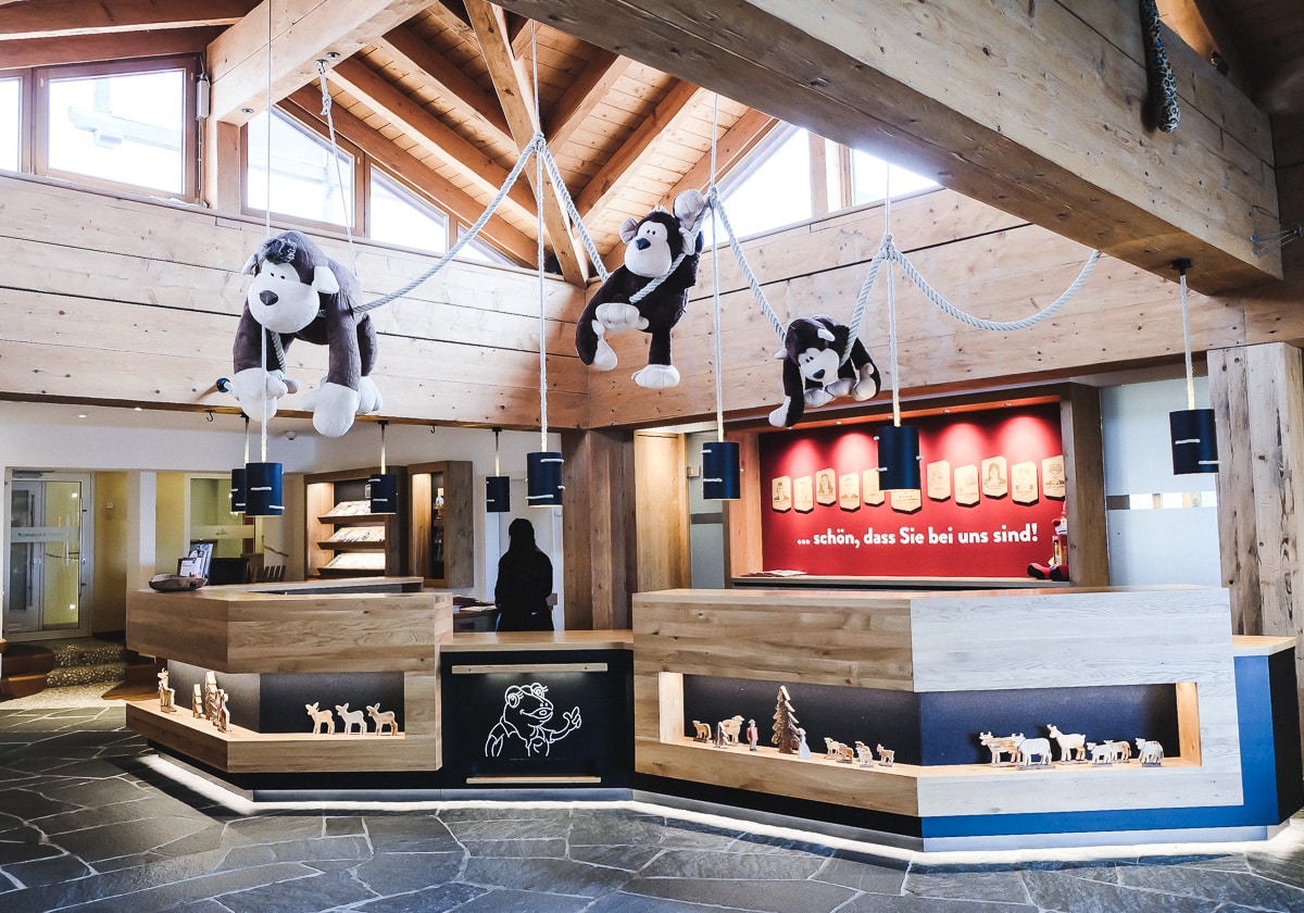 Bei der Ankunft gibt es zum Glück Kofferwagen, denn unser vieles Gepäck wollte schließlich transportiert werden. Schon beim Eintritt in die Rezeption merkt man: Hier dreht sich alles um die Kinder! Große Plüsch-Affen hängen an der Decke und Schaukelpferde stehen bereit, um den Kindern den Check-in Vorgang zu verkürzen.