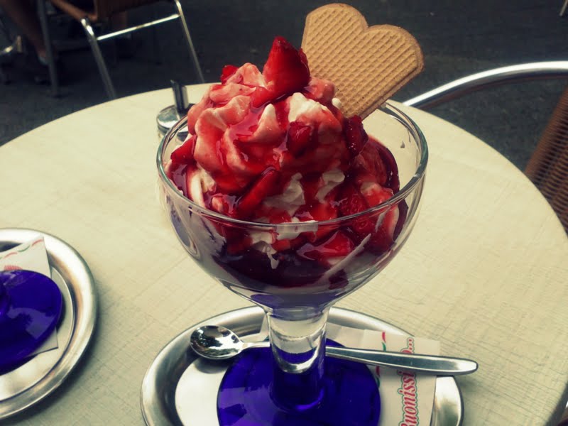 |Gegessen| Auf der Geburtstagsfeier leckeren Erdbeerkuchen, beim Grillen vegetarische Gemüsespieße und als Belohnung für die Radtour am Sonntag noch einen Joghurt-Erdbeer-Becher in der Eisdiele um die Ecke.