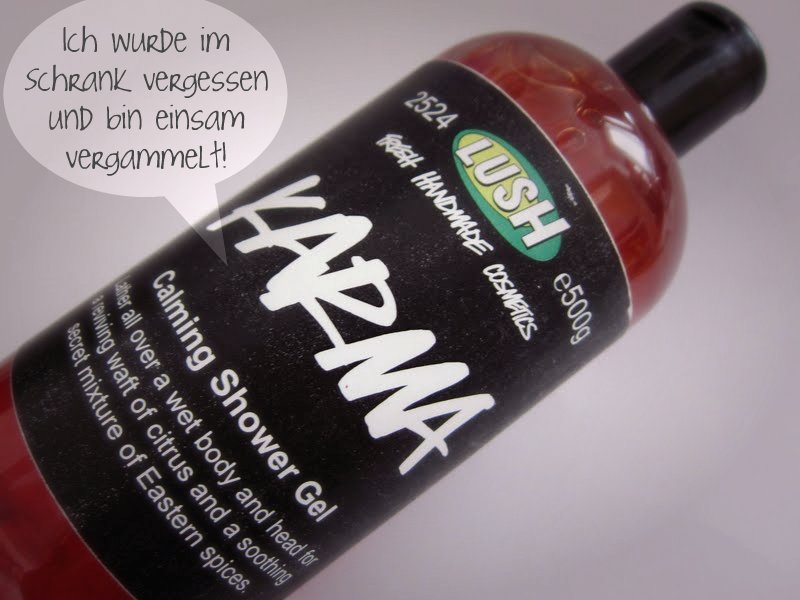 Doch damit ist nun Schluss! Folgendes Ereignis hat mir den Irrsinn des Kosmetikbunkerns wieder bewusst gemacht: Neulich entdeckte ich eine noch völlig unbenutzte Flasche Lush Karma Duschgel im Schrank. Vergammelt! Tja, da hätte ich die 30 Euro, die das limitierte Duschgel damals im Karlsruher Lush Shop gekostet hat, auch direkt in den Mülleimer werfen können! Das zeigt doch mal wieder wie unsinnig es ist Kosmetikprodukte zu bunkern. Und seien es noch so tolle, ultralimitierte Specials die es nur für kurze Zeit zu kaufen gibt. Man denkt vielleicht, man verpasst etwas, wenn man sich dieses Special entgehen lässt. Wenn es anschließend vergessen im Schrank oder in der Schublade vor sich hingammelt und letztlich vielleicht sogar im Müll landet, hatte man auch nichts davon. Außer viel Geld in den Sand gesetzt. Außerdem nimmt der Kram nur unnötig Platz weg und bei 10 Flaschen Duschgel in der Dusche ist es ja kein Wunder, dass nie eins leer wird.