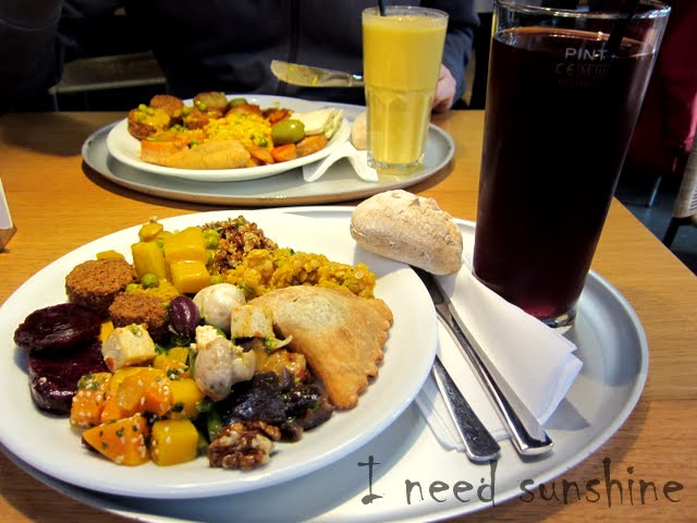 Dieses mal waren wir bei Tibits, ein vegetarisches Selbstbedienungsrestaurant in der Nähe des Picadilly Circus (12-14 Heddon Street, Seitenstraße abgehend von der Regent Street). Man kann sich am Buffet einfach selber sein Essen zusammenstellen. Der Teller wird anschließend an der Kasse gewogen und man bezahlt nach Gewicht. Wir wurden sehr freundlich begrüßt und man erklärte uns, wie alles abläuft. Zu zweit haben wir für Essen und je ein Getränk ca. 25 Pfund bezahlt. Das Essen war wirklich lecker und in solchen Restaurants neige ich immer dazu, mir zuviel aufzuladen, da es immer so verlockend aussieht.