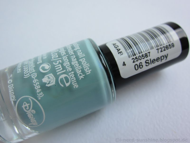 “Sleepy” ist ein türkisblauer Lack mit einem schönen Schimmer. Die Konsistenz ist etwas fester und somit lässt sich der Lack nicht ganz so einfach und gleichmäßig lackieren. Schade eigentlich, denn von der Farbe her ist er eindeutig mein Favorit. Mit zwei Schichten ist der Lack deckend.