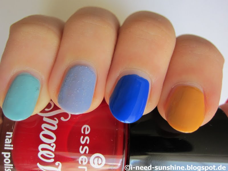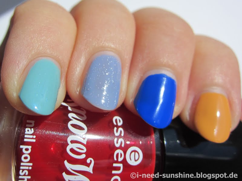 Ich habe einfach mal alle Farben auf einmal lackiert, um die Lacke miteinander vergleichen zu können. Ich habe eine Schicht Unterlack, zwei Schichten Farblack und eine Schicht des Essence Better Than Gel Nails Top Sealer aufgetragen.