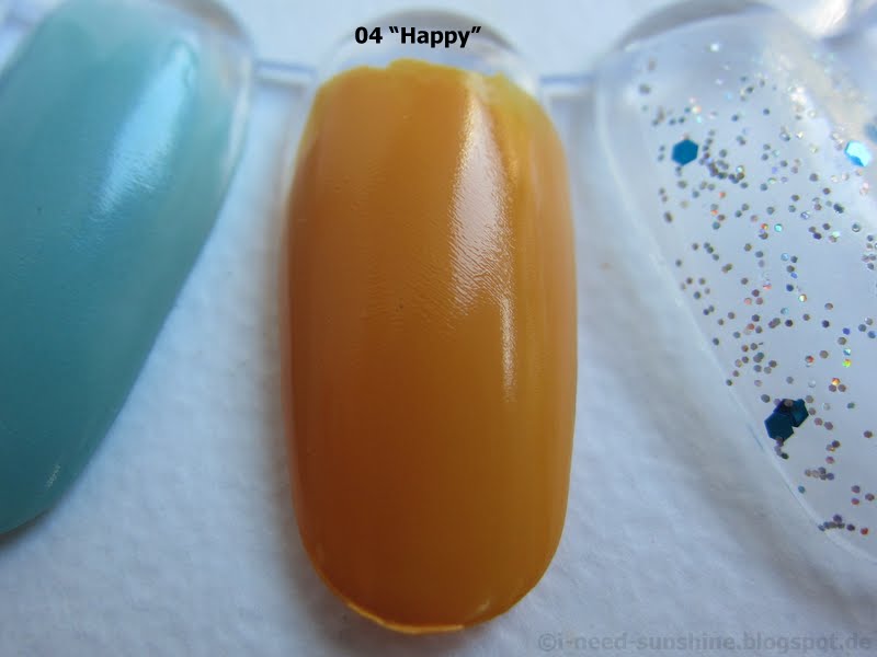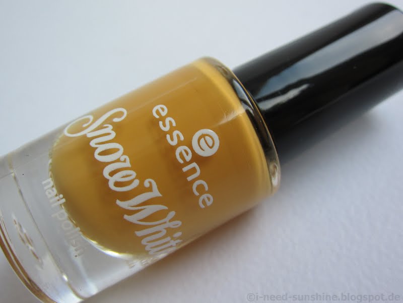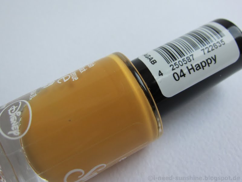 “Happy” ist ein dunkler Gelbton mit Cremefinish. Die dadurch festere Konsistenz führt dazu, dass der Lack langsamer trocknet als “Grumpy” und “Snow White”. Dafür deckt er gut.