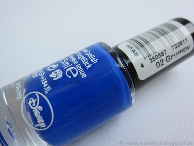 “Grumpy” ist ein royalblauer Nagellack und hat eine ähnliche Konsistenz wie “Snow White”. Der Lack ist ebenfalls sehr flüssig, dafür trocknet er zügig auf den Nägeln. Die Deckkraft ist hier aber im Gegensatz zu “Snow White” sehr gut.