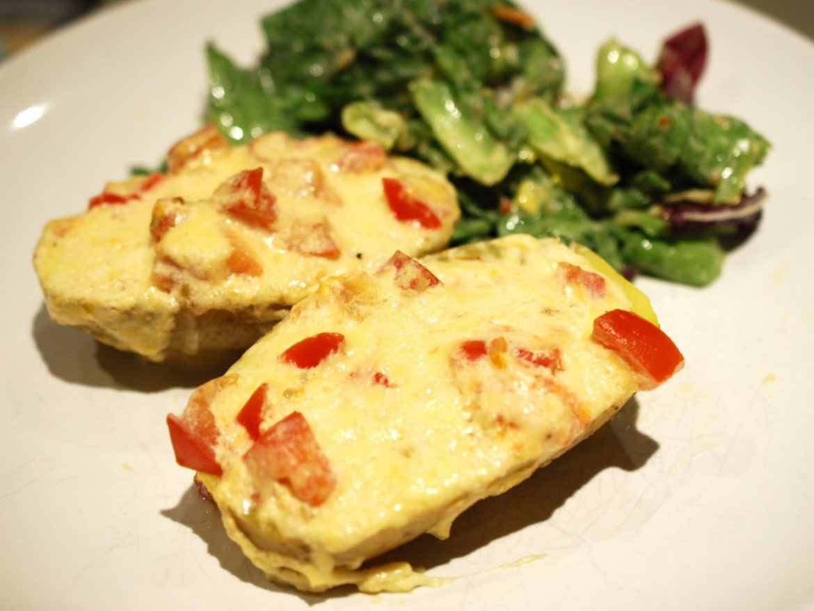 - Die Füllung auf den Kartoffeln verteilen und noch einmal für 3 Minuten bei 100°C im Dampfgarer garen. Dazu passt ein gemischter Salat.