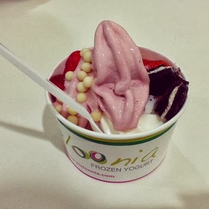 In Frankfurt landeten wir zufällig im Skyline Plaza Shopping Center, welches wohl erst vor kurzem aufgemacht hat. Dort gab es einen Shop mit Frozen Yogurt zum selbst mischen! Ich entschied mich für eine Mischung aus Heidelbeer- und fett- und was weiß ich noch alles freien Frozen Yogurt mit Oreos, Erdbeeren, weißer Schokolade und Heidelbeeren. |