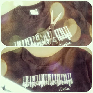 Schon lange nervte mich der enge Halsauschnitt meines Cursive-Band-Shirts, der meinen Hals immer so kurz aussehen ließ! 😉 Heute war ich endlich mutig genug und griff zur Schere. Das Ergebnis ist gar nicht so schlecht geworden. Wenn es den nächsten Waschgang überlebt, werde ich das noch mit weiteren Band-Shirts machen. |