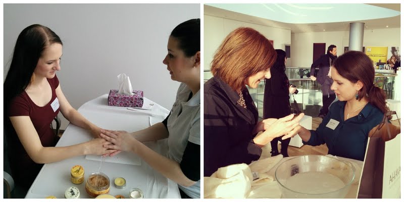 Es gab gleich mehrere Gelegenheiten für eine entspannte Handmassage: Tanja genoß die Handmassage beim Burt’s Bees Stand // Sabrina bekam am Ahava Stand ein Handpeeling, die interessante Pflegeprodukte mit Salz aus dem Toten Meer im Sortiment haben. Ich kam auch in Genuss von beidem und es war wirklich sehr angenehm 😉